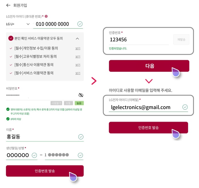 • [회원가입]에 필요한 개인 정보를 입력한 후 [인증번호 발송] 버튼을 터치해주세요.