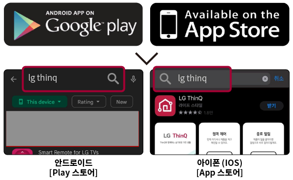 안드로이드폰의 경우 play 스토어, 아이폰의 경우는 App 스토어를 클릭하여 LG ThinQ 앱을 설치해주세요. (앱 다운로드)